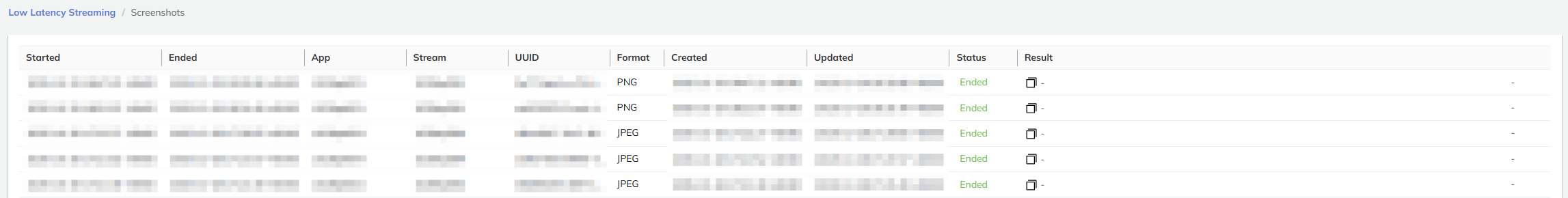 Provide query access to all live screenshot task information. It displays basic fields such as domain name, app name, stream name, and start time, as well as task status, result, and access URL.