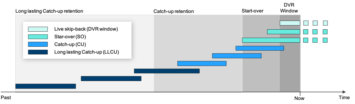 LLCU (Long-lasting Catch-up): Allows access to content beyond the live buffer by creating and uploading VOD assets to storage. CMS is responsible for retention and deletion.