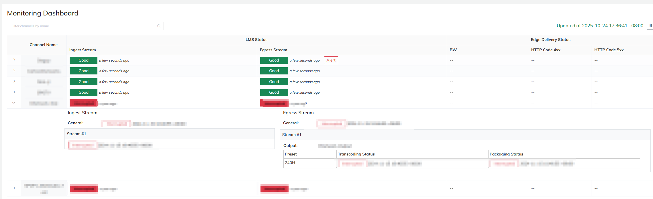 Monitoring Display an overview of all channels, including ingest and transcoding status, and delivery metrics such as bandwidth and HTTP 4xx/5xx responses. Channels with abnormal status or alerts are highlighted. Details can be expanded for further inspection.
