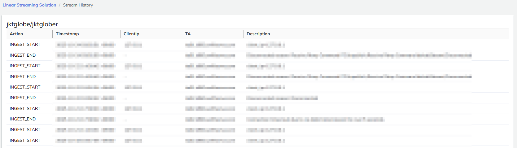 Display the stream connection history, including start and end times, client IP, and destination TA.